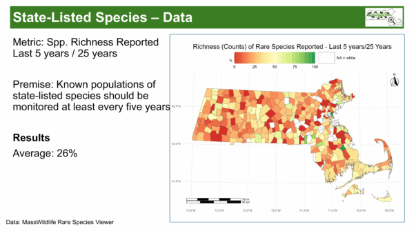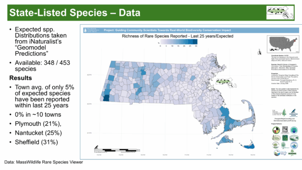 The CBI uses publicly available datasets to recruit, motivate, and support local conservation organizations in developing volunteer-led species reporting programs. Now working with 13 partner organizations across Massachusetts, and actively recruiting others, we conduct statewide analyses to identify locations where species observations are most needed, provide training and field guidance for volunteers, and help partners establish sustainable reporting efforts in their own communities.