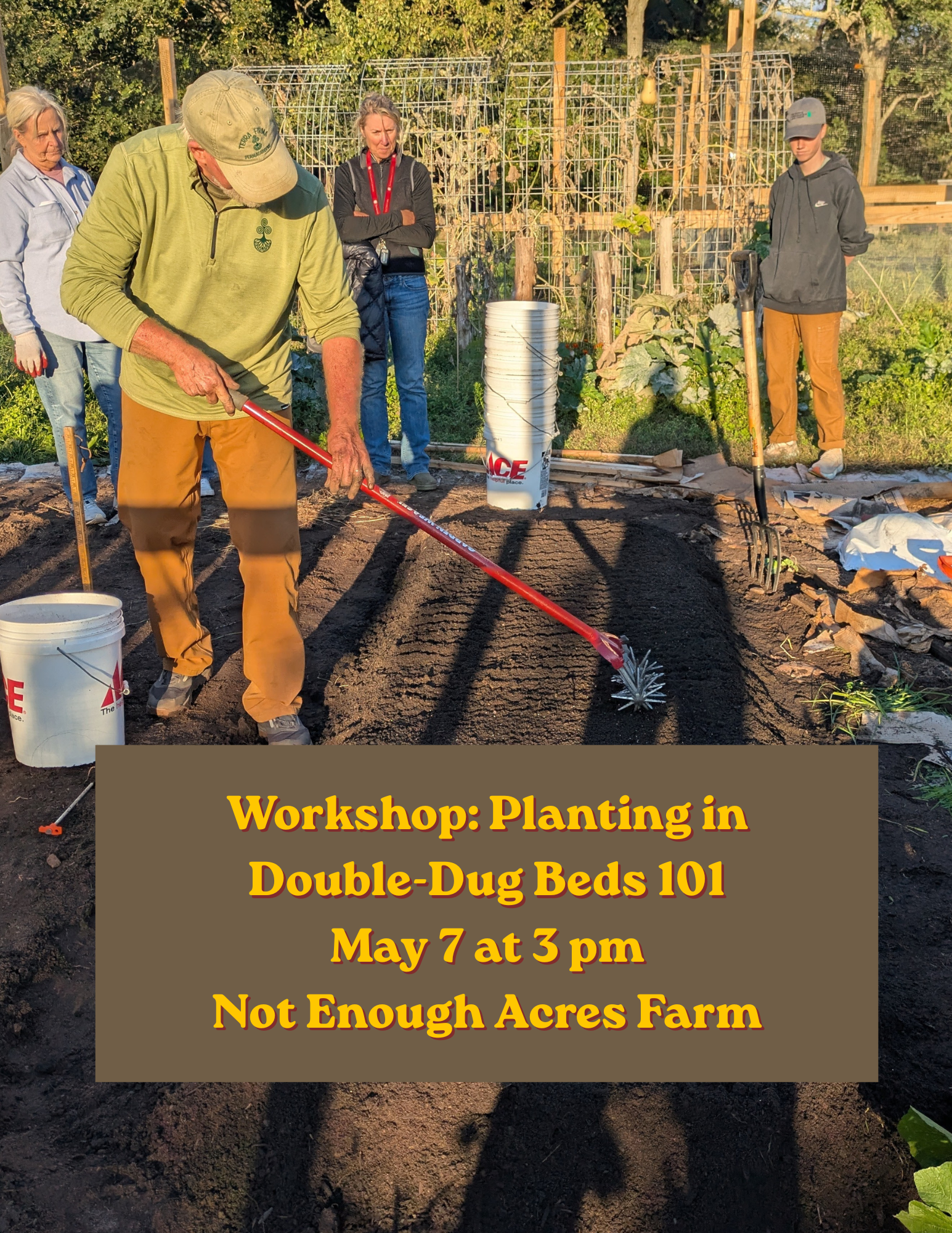 On Thursday, May 7 at 3pm, Peter will be back for a workshop about how you can plant “intensively” in these beds–that is maximize space to grow the most veggies! Join us at Not Enough Acres Farm for the fun.